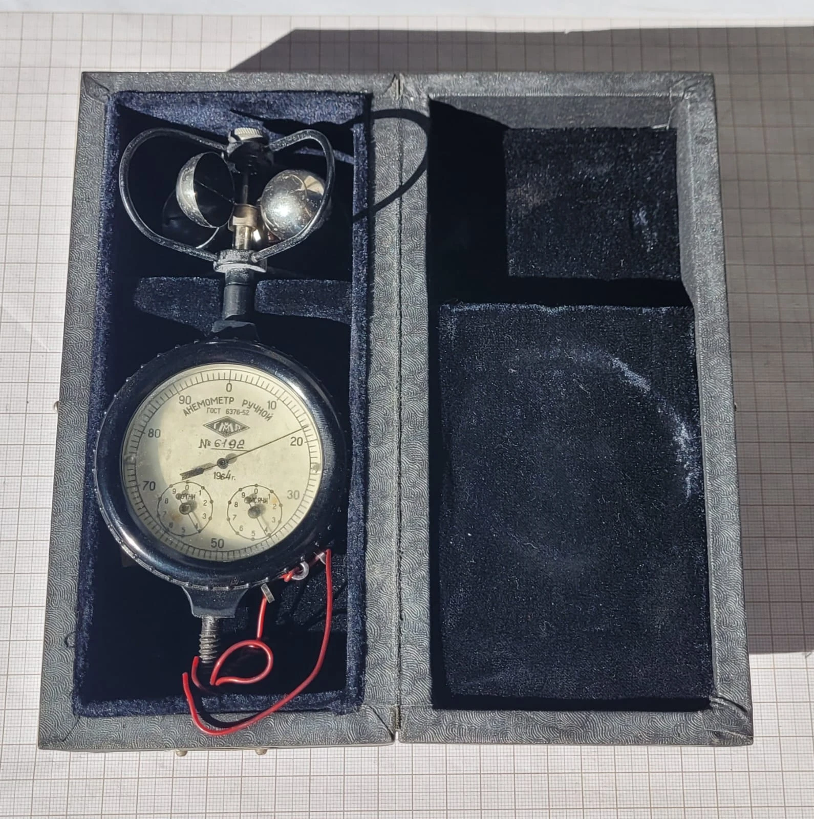 Zabytkowy ręczny anemometr kubkowy produkcji radzieckiej z 1964 roku. Klasyczny przyrząd pomiarowy stosowany do określania prędkości wiatru oraz przepływu powietrza.