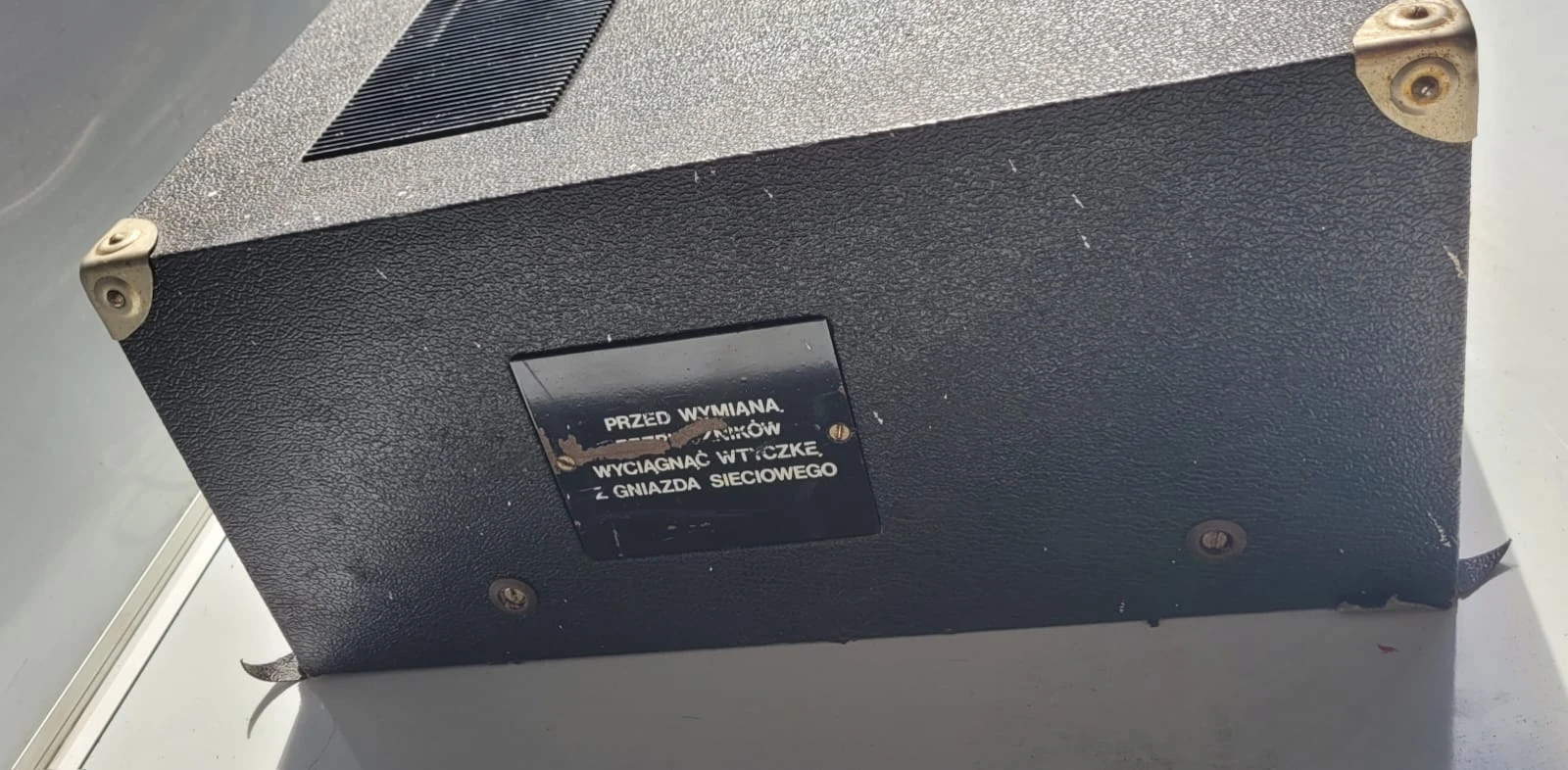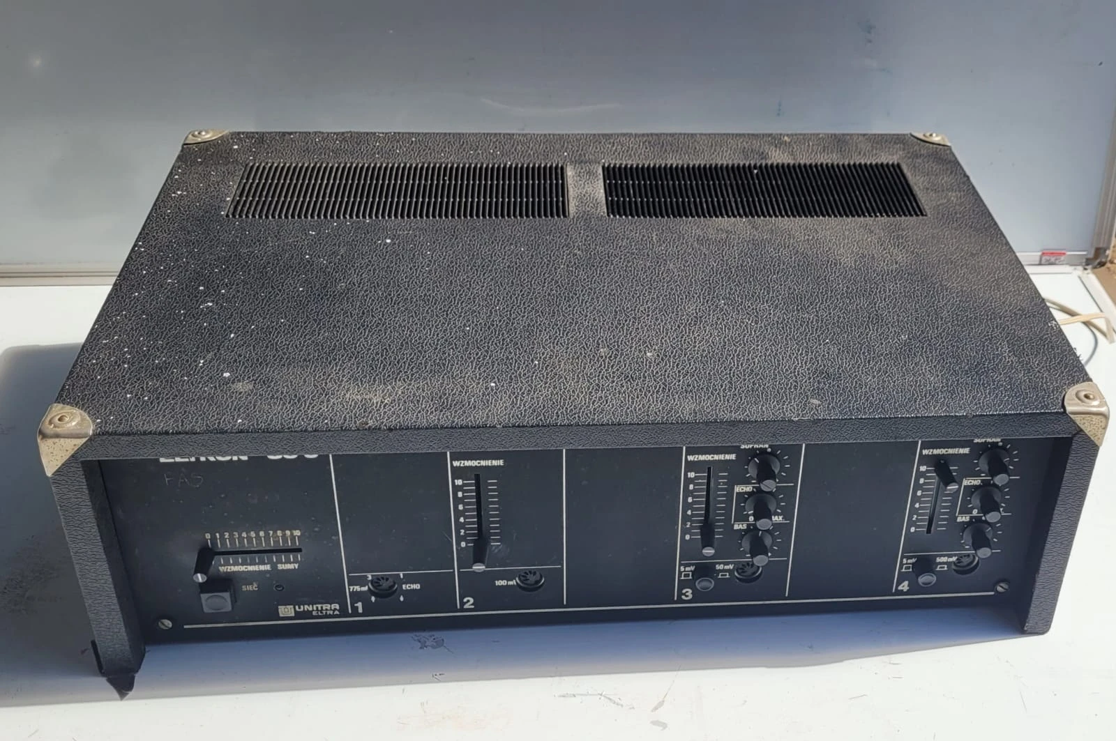 Zabytkowy wzmacniacz estradowy / mikser mocy Unitra Eltra, prawdopodobnie z profesjonalnej serii nagłośnieniowej z okresu PRL. Klasyczny sprzęt audio używany w systemach scenicznych i instalacjach nagłośnieniowych.