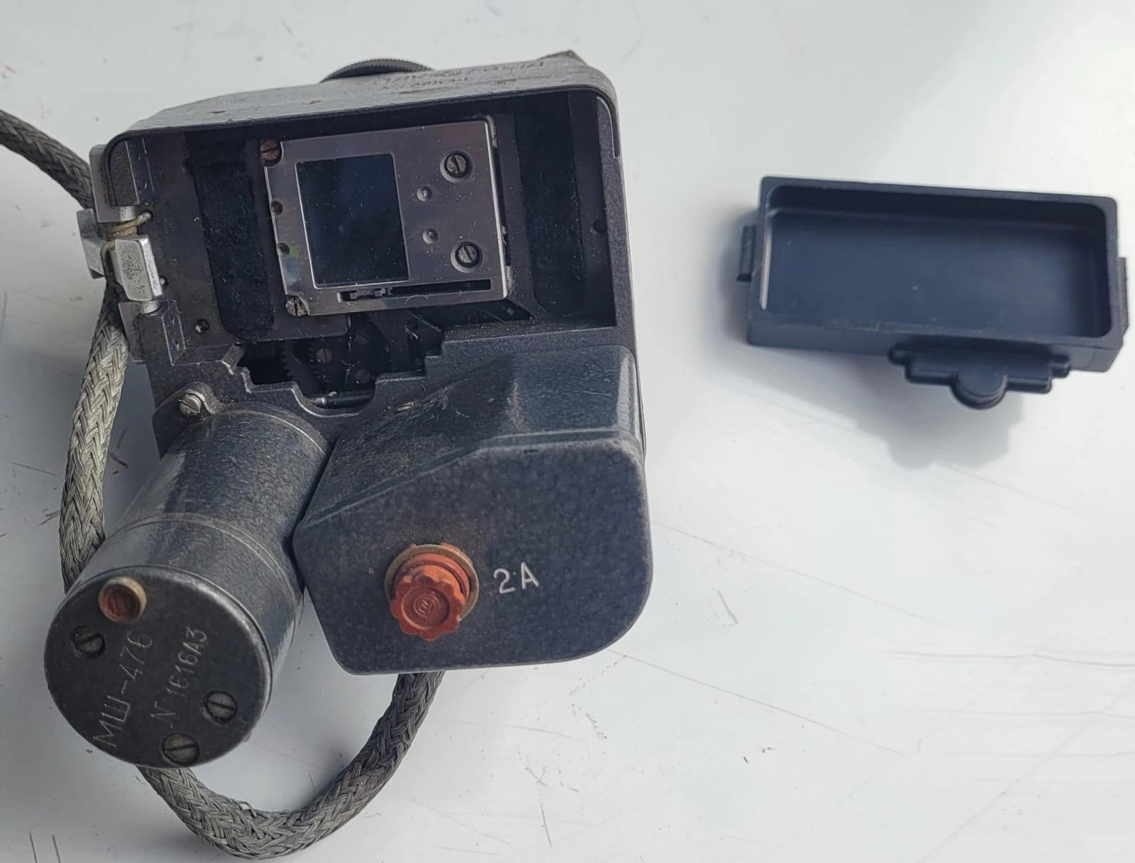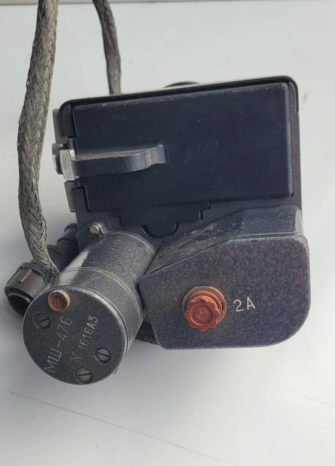 Oryginalny radziecki fotokarabin lotniczy PAU-476-1A, stosowany w samolotach wojskowych do rejestracji celowania i przebiegu strzelania podczas ćwiczeń. Specjalistyczny sprzęt szkoleniowy lotnictwa.