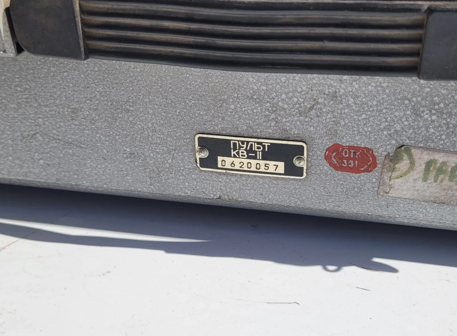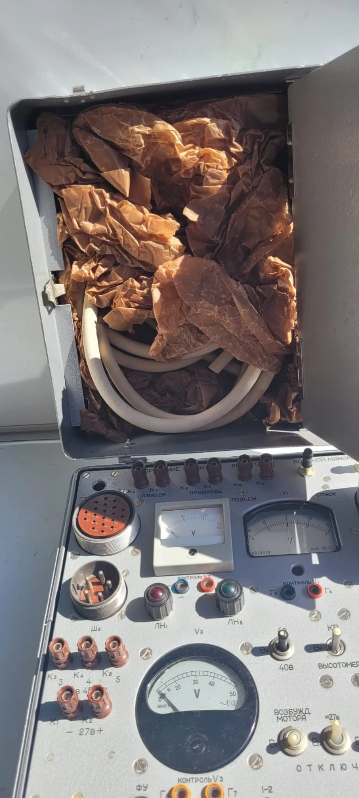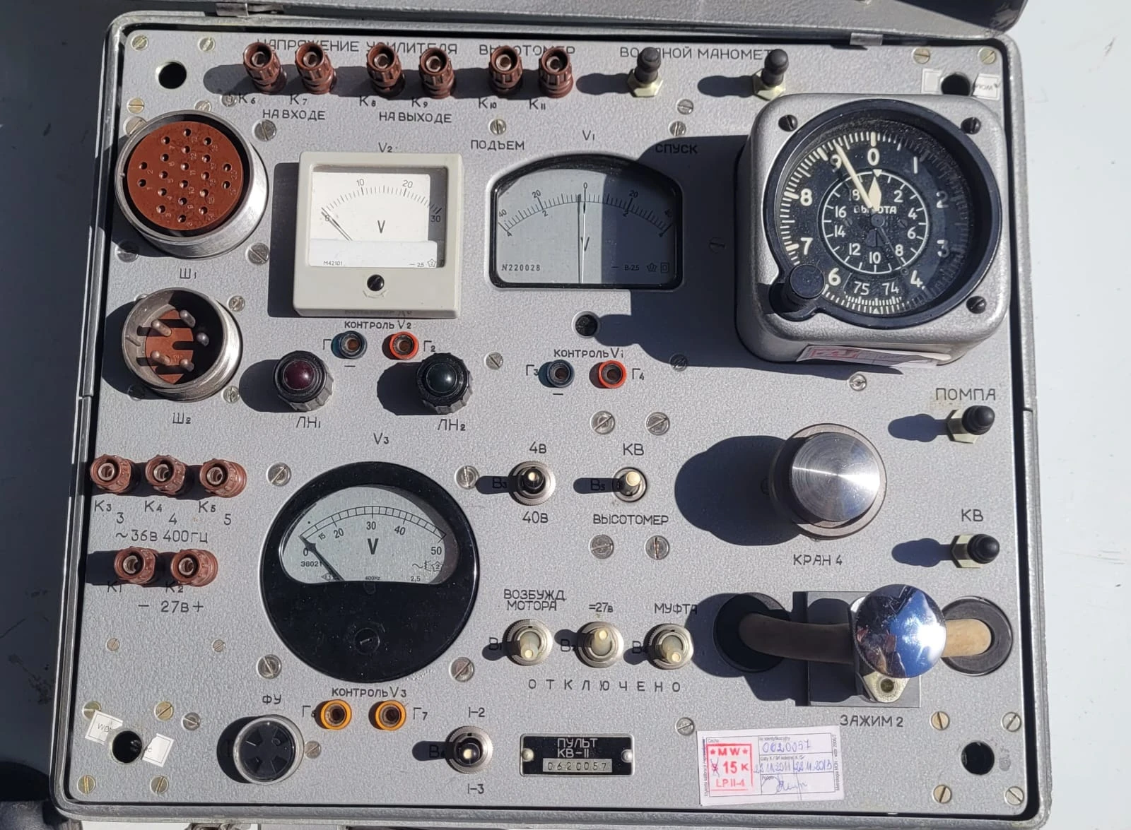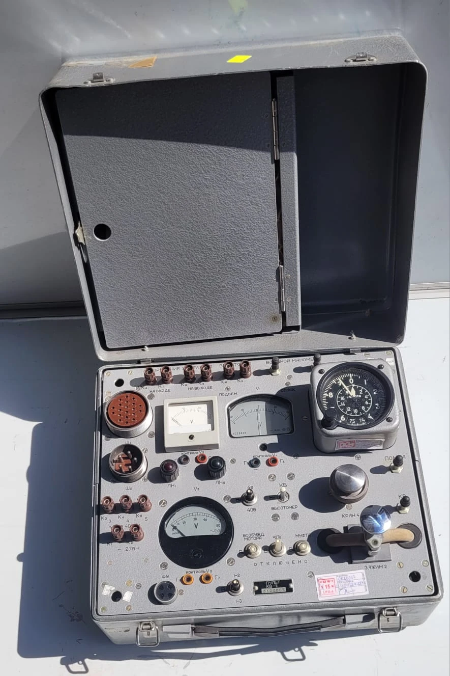 Specjalistyczna konsola testowa / pulpit sterowniczy KV-11, przeznaczona do kontroli i serwisowania korektora wysokości KV-11 (КВ-11). Element aparatury kontrolno-pomiarowej stosowanej w lotnictwie wojskowym i cywilnym.