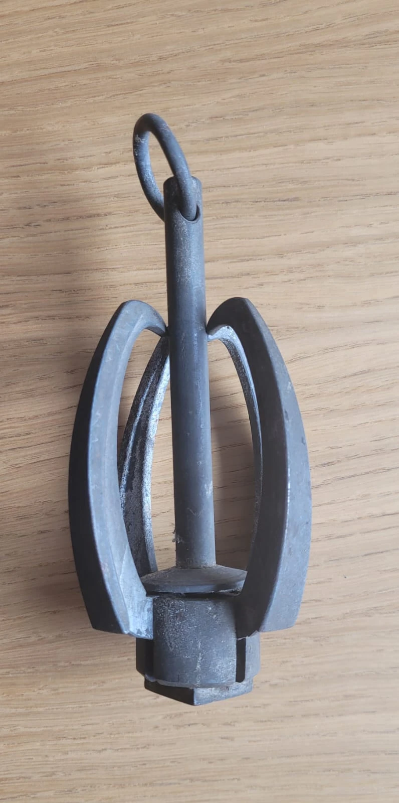 Kotwiczka saperska o wysokości ok. 16 cm i wadze ok. 600 g, pochodząca z demobilu wojskowego. Element tego typu był wykorzystywany w zastosowaniach inżynieryjnych i saperskich do mocowania, kotwiczenia oraz stabilizacji elementów w terenie.