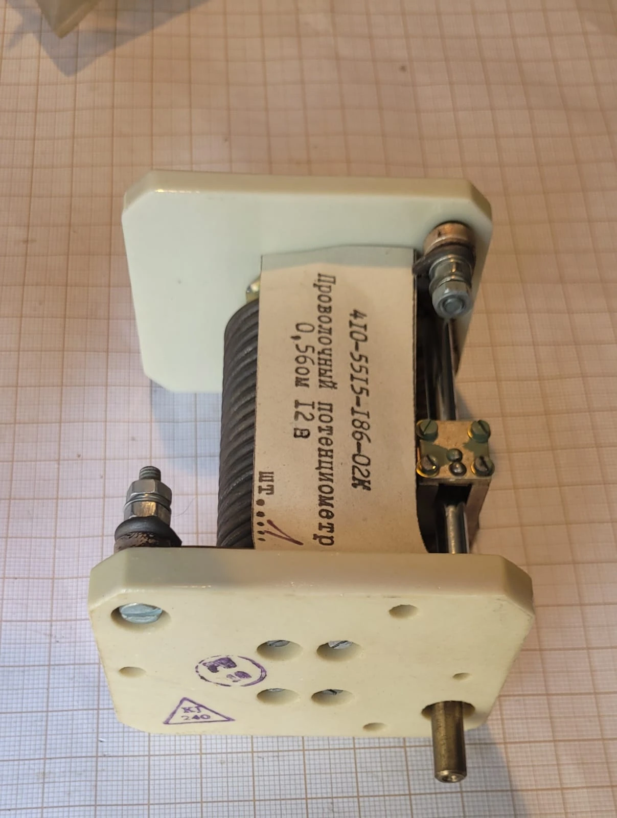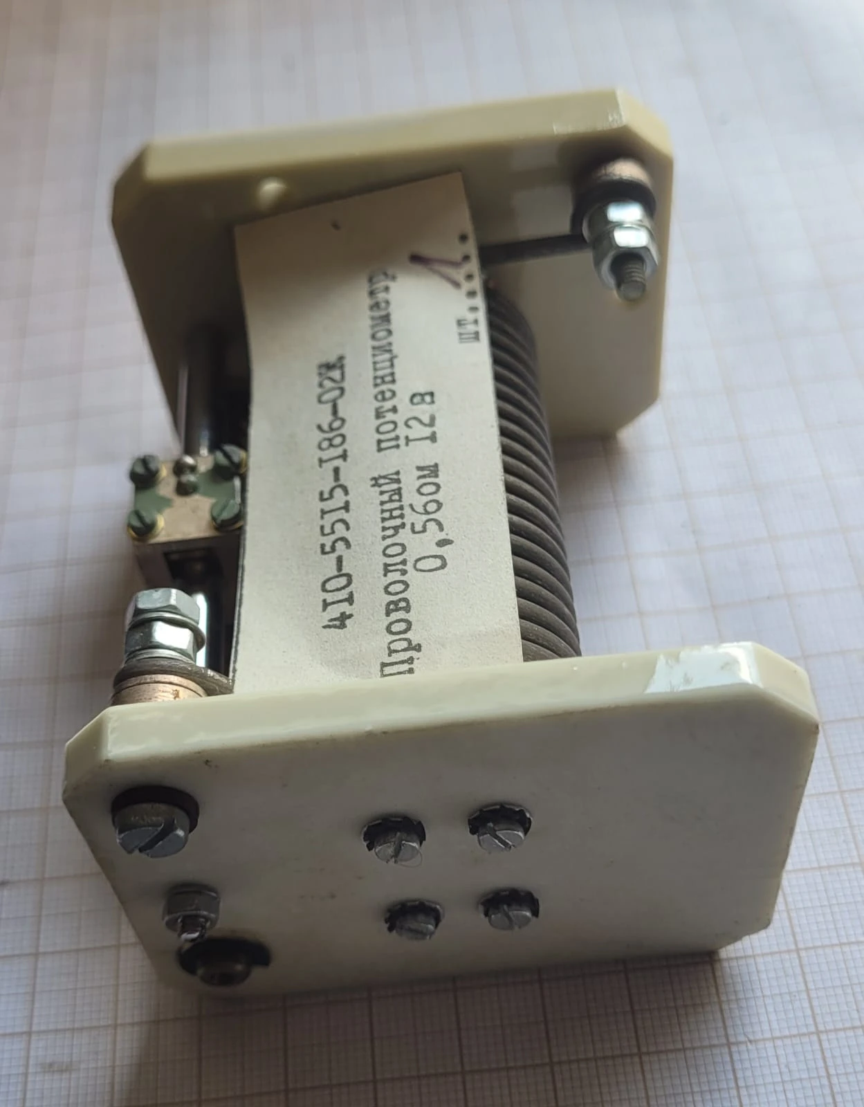 Radziecki potencjometr drutowy typu 410-5515-186-02K przeznaczony do regulacji w układach dużej mocy i obciążeniach prądowych. Element ten stosowany był w urządzeniach przemysłowych oraz technice wojskowej.