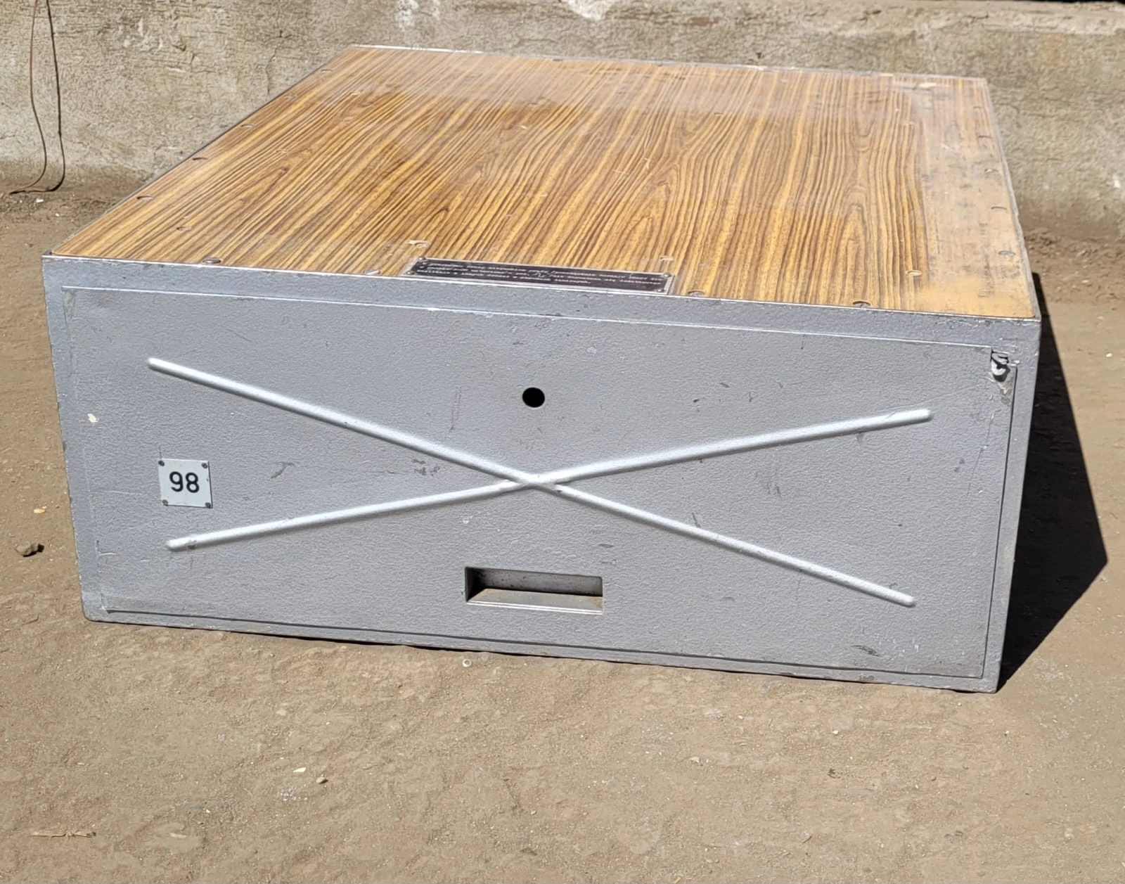 Metalowa szafka warsztatowa o wymiarach około 67 × 28,5 × 70 cm, wyposażona w jedną dużą, pojemną szufladę, przeznaczona do przechowywania narzędzi oraz elementów technicznych.