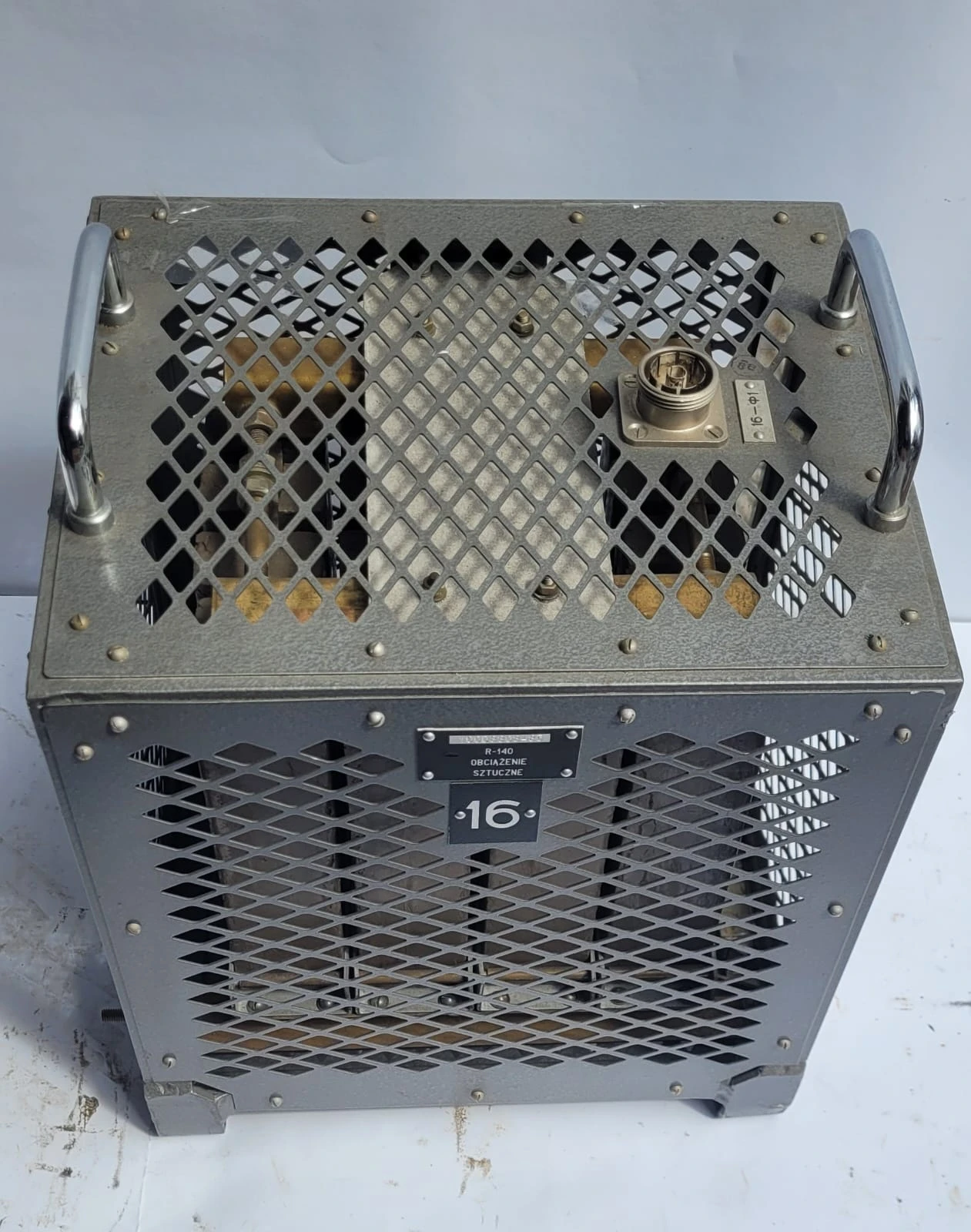 Sztuczne obciążenie R140 o mocy 1 kW, stosowane w technice radiowej i pomiarowej do testowania oraz obciążania nadajników i wzmacniaczy. Solidny element przemysłowy przeznaczony do pracy z dużą mocą.
