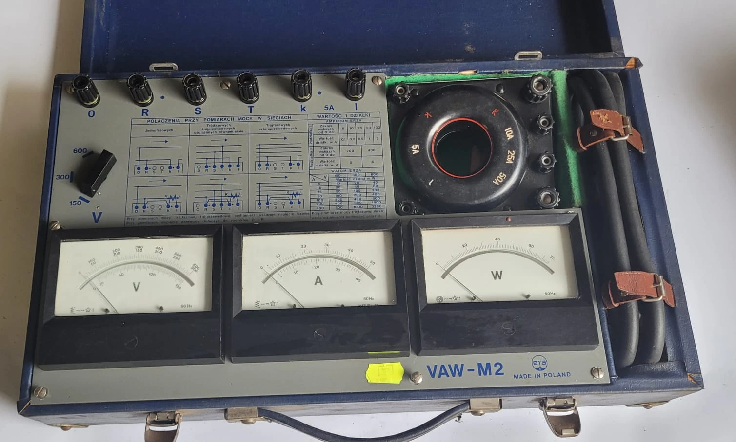 Oryginalna walizka pomiarowa VAW-M2 polskiej produkcji, używana przez monterów i elektryków do wykonywania podstawowych pomiarów w instalacjach elektrycznych. Solidny, praktyczny zestaw w formie przenośnej walizki, przeznaczony do pracy w terenie i warsztacie.