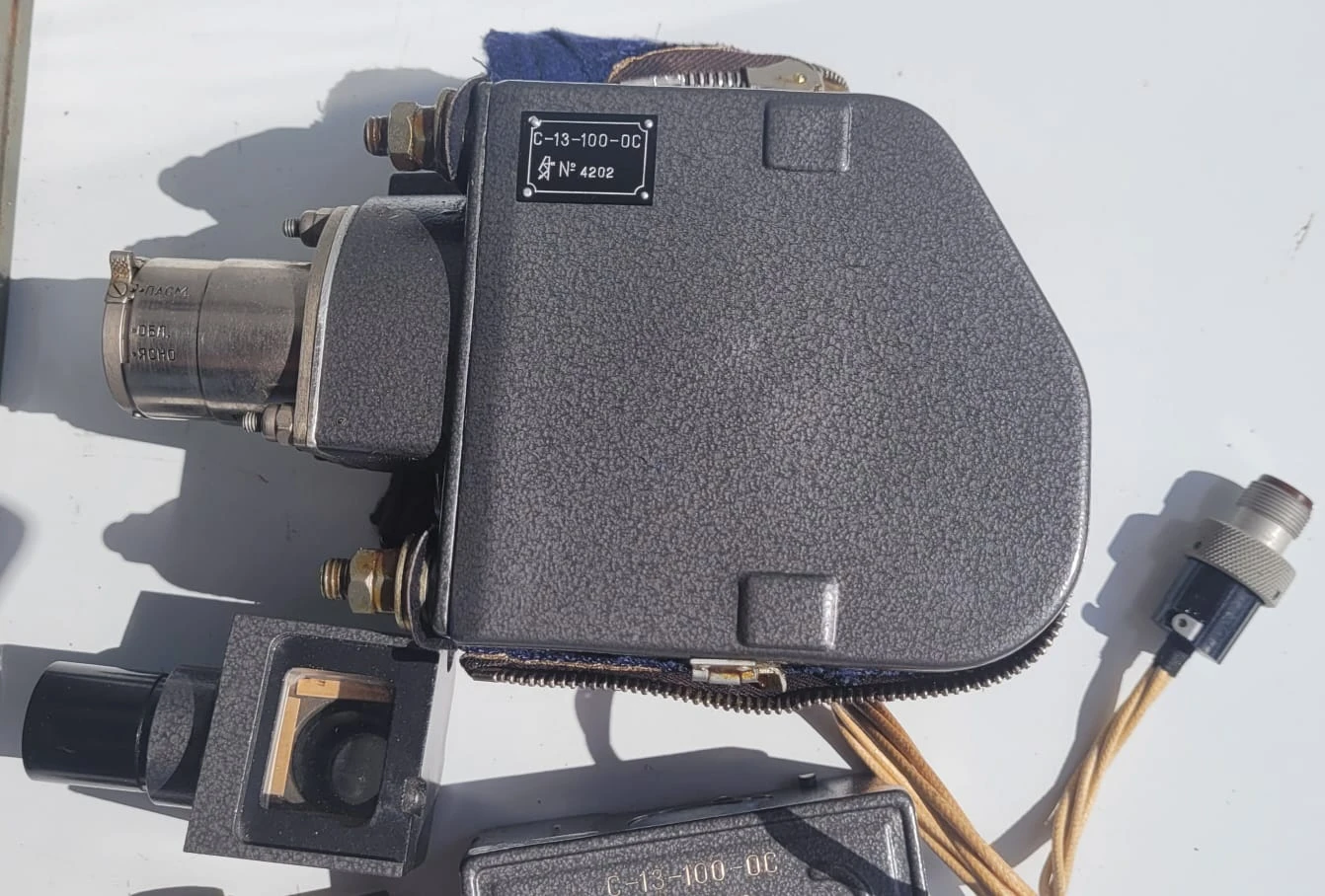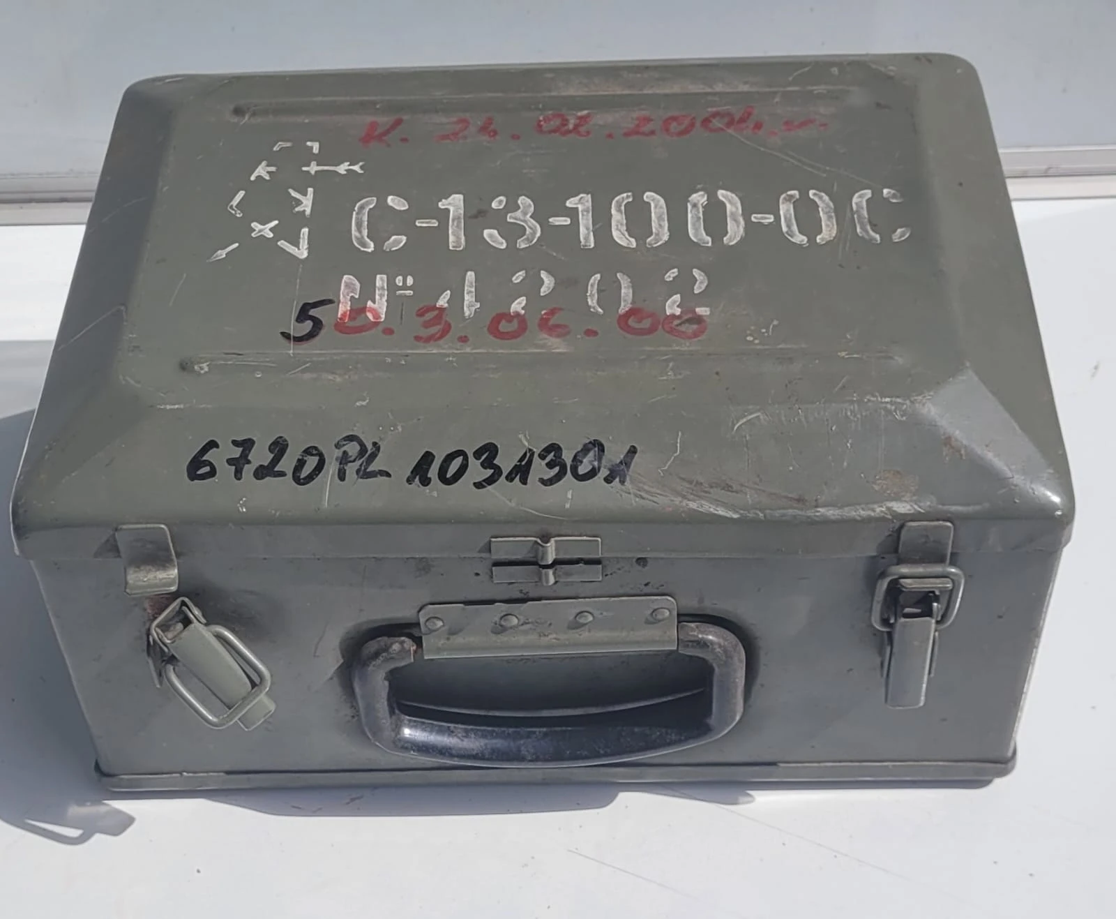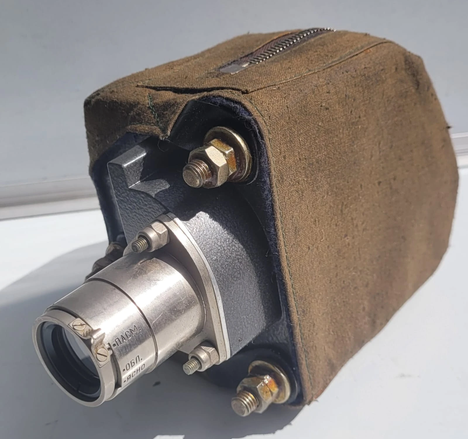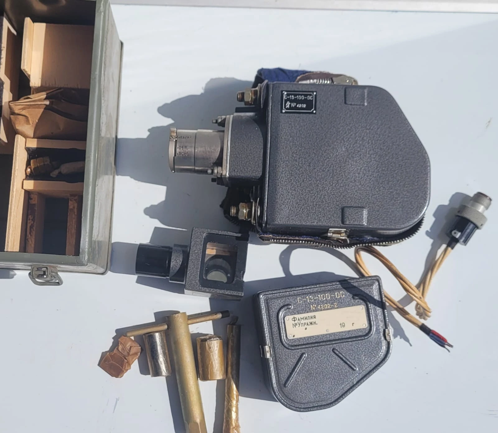 Oryginalny zestaw fotokarabin S-13-100-OS z akcesoriami, stosowany w szkoleniu pilotów i ocenie celności strzelań w lotnictwie wojskowym. Żadko spotykany eksponat.