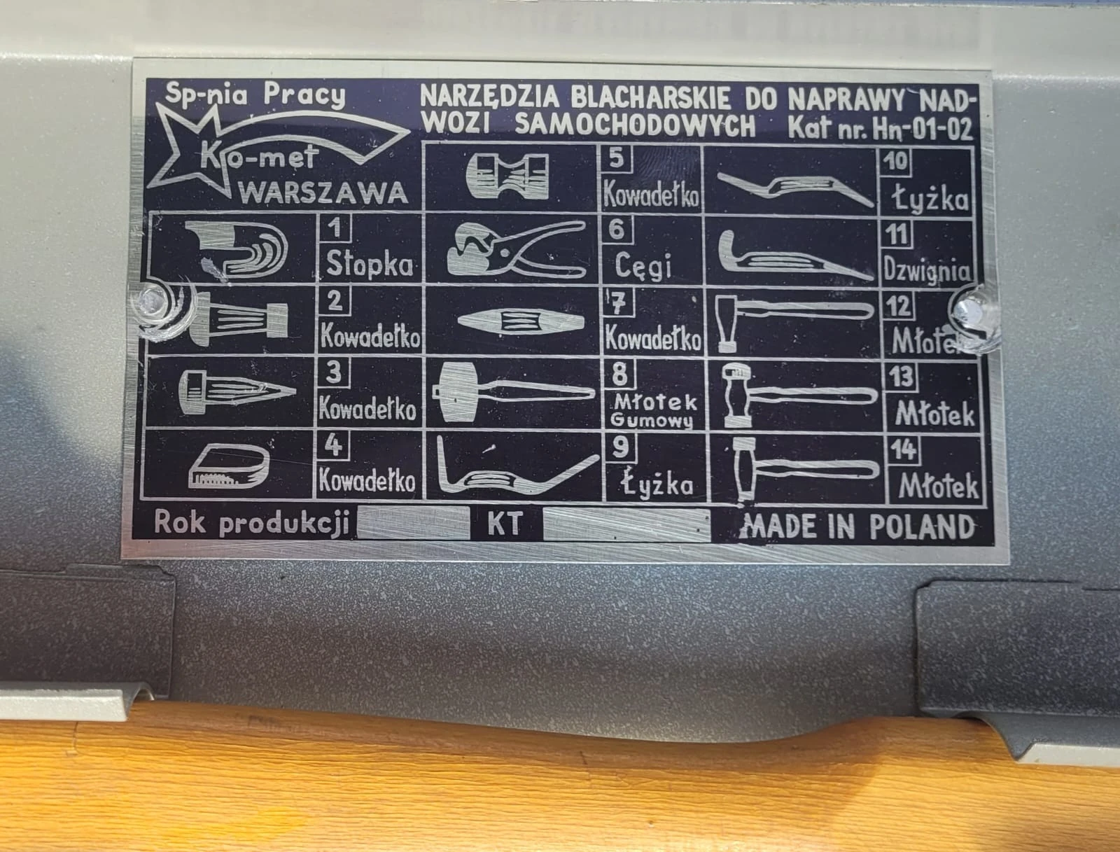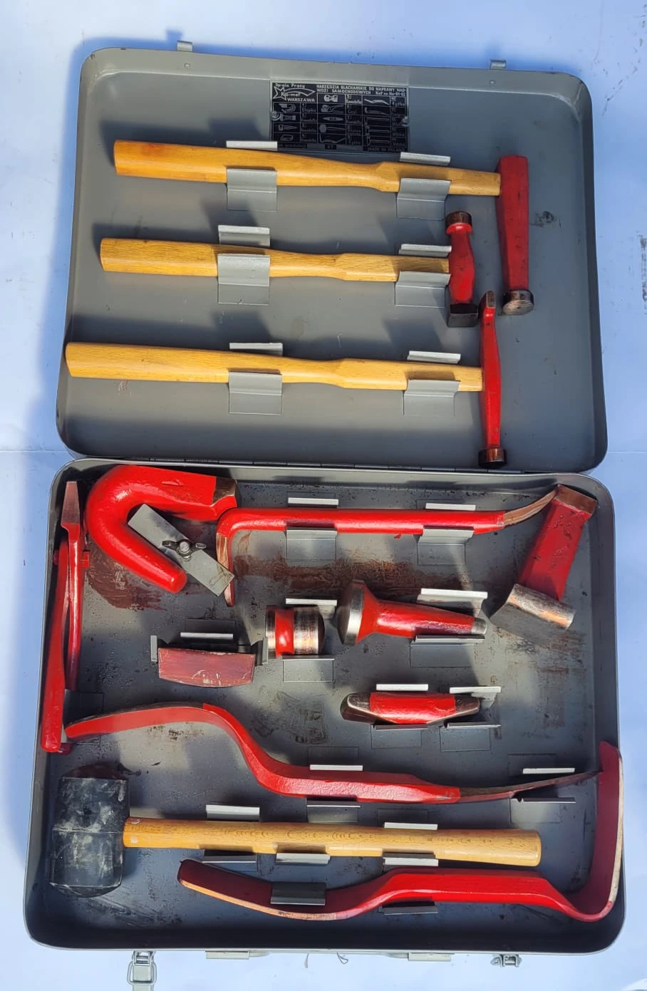 Profesjonalny zestaw narzędzi blacharskich do naprawy nadwozi samochodowych, produkcji polskiej. Sprzęt w stanie jak nowy, gotowy do pracy w warsztacie lub garażu.